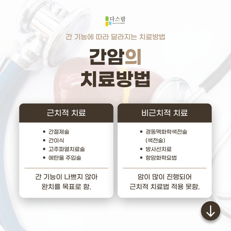 - 간 이식술 : 심각한 간 손상이나 다발성 종양의 경우 시행