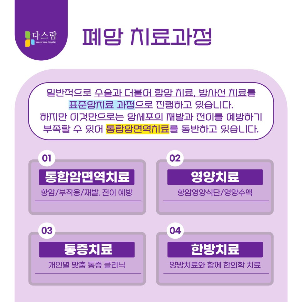 다스람요양병원은 폐암 환자분들이 치료 이후에도 건강하고 활기찬 삶을 이어갈 수 있도록, 의학적 근거와 환자 중심의 케어를 결합한 맞춤형 치료를 제공합니다.