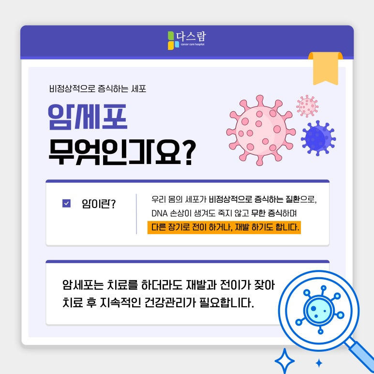오늘은 서울암병원을 대표하는 저희 다스람요양병원과 함께 암 수술 후 면역력 회복을 위한 치료와 더불어 그 중심에 있는 자닥신에 대해 알아보려고 해요.
